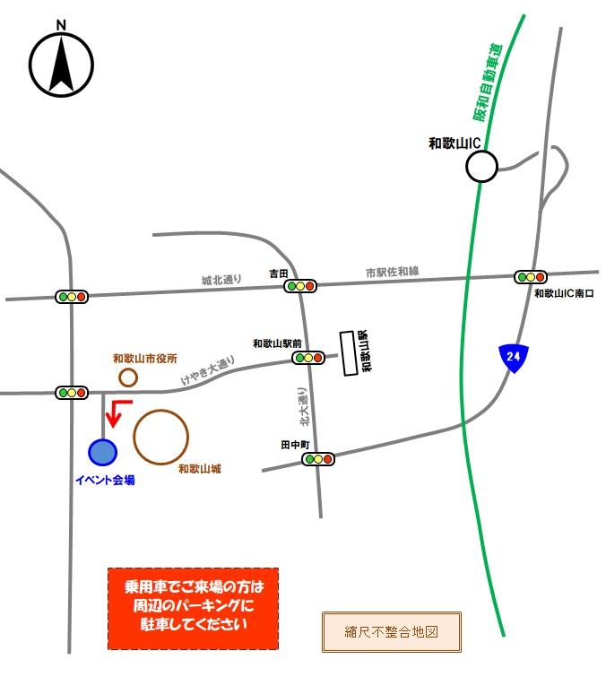 会場周辺への路上駐車、商業施設等への駐車は禁止です。