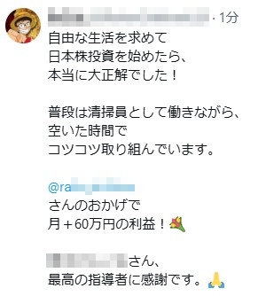 比較的最近多くみられるのが「誰かのおかげで儲かった」アカウントです。
